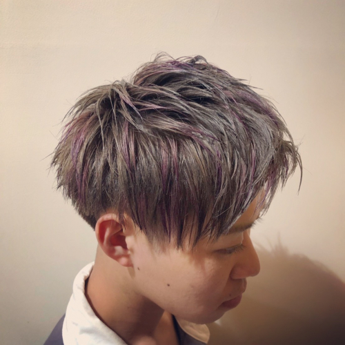 本当はグレーのワントーンのカラーの予定だったのですが僕がリクエストしてハイライトを入れていただきたいとお願いしたところこんなに綺麗にムラサキのハイライトを入れていただけました!